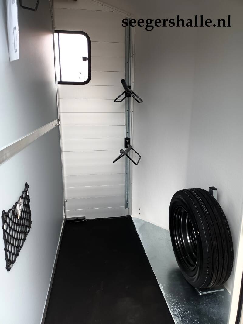 - Ruime zadelkamer voorzien van 3 puntsluiting, schuifraam, verlichting, verstelbare zadelsteunen, spiegel, hoofdstelhouders, opbergnet